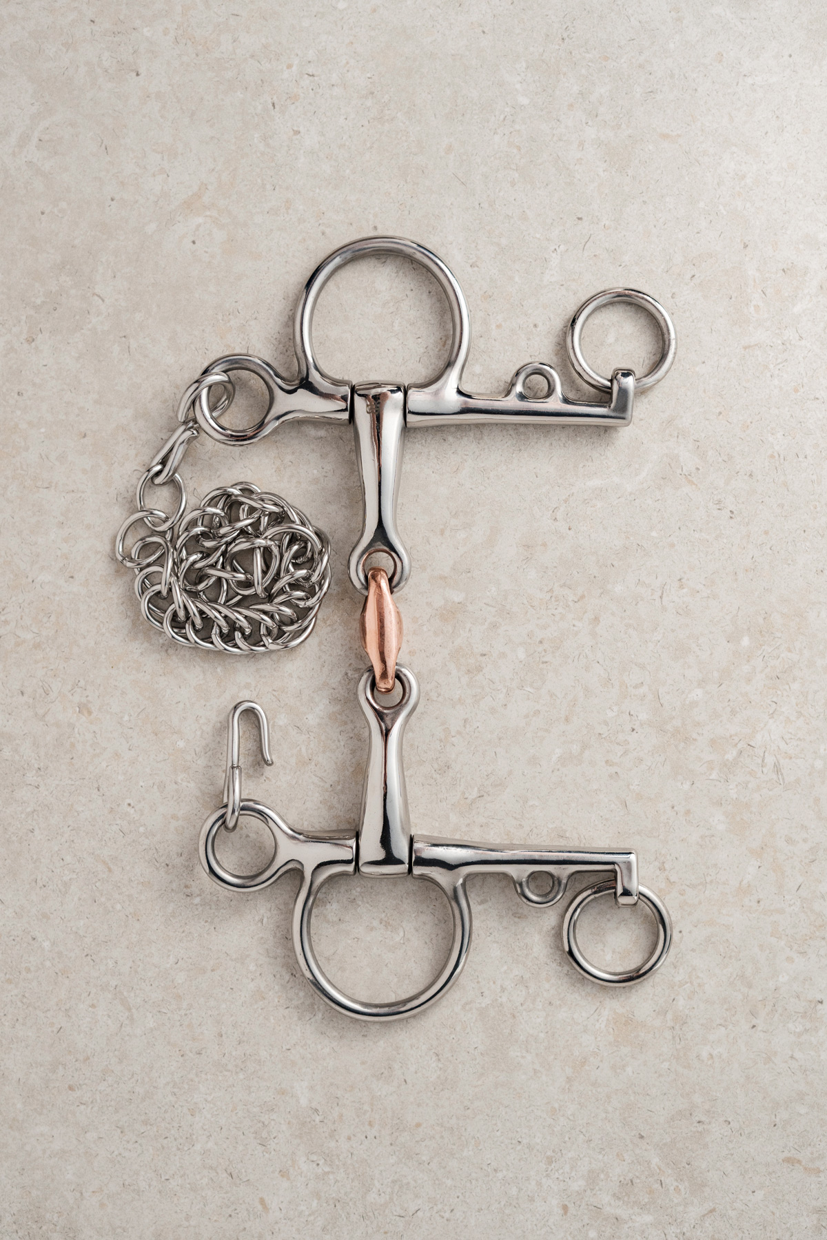 The Pelham with a double jointed mouthpiece and copper lozenge offers a gentler mouth feel, distributing pressure evenly across the tongue and bars. This design reduces the nutcracker effect of single-jointed bits. The copper lozenge creates a positive effect and acceptance of the bit. Copper is a warm and soft metal, emitting a sweet and pleasant taste. This creates a warming sensation which encourages salivation and mouthing on the bit. Additionally, double-jointed mouthpieces can influence curb action, minimizing direct pressure by focusing more on the bars of the mouth.