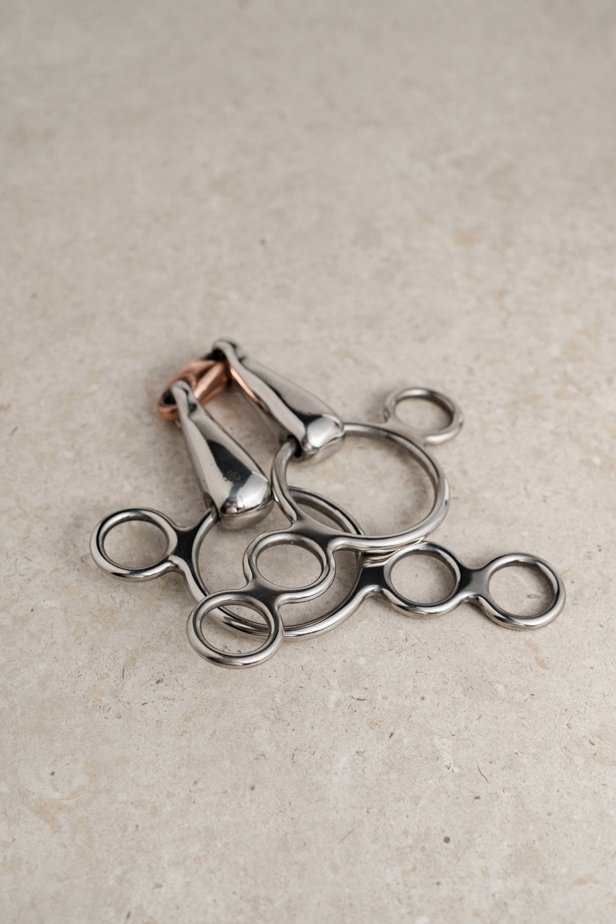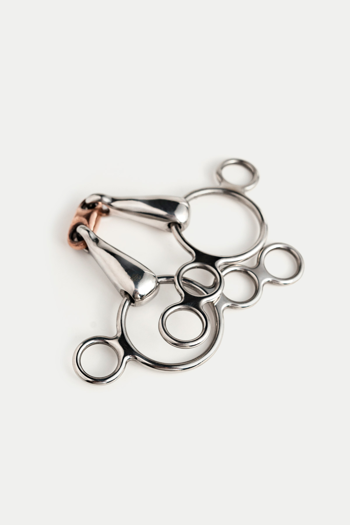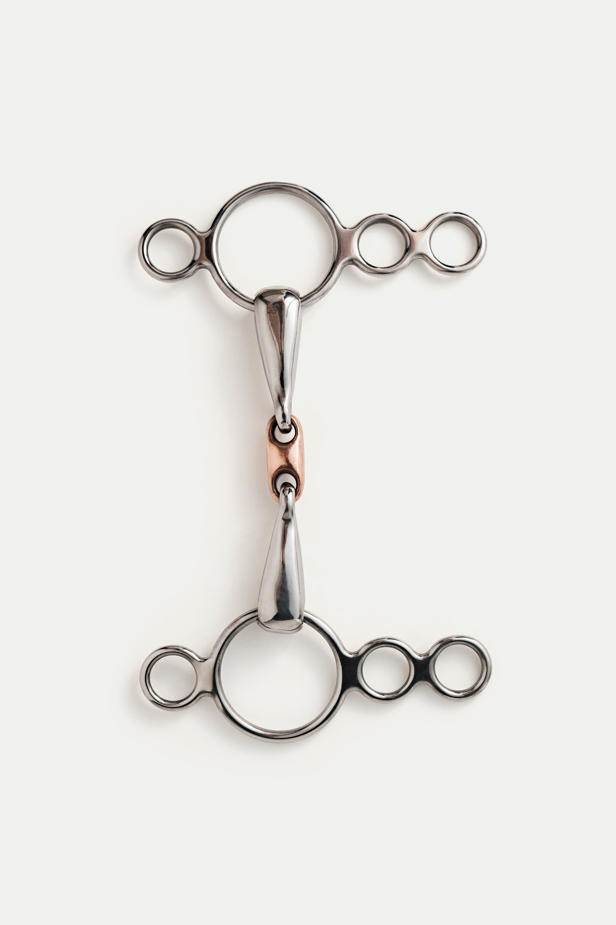 This bit features three rings, with the top ring attaching to the cheek pieces of the bridle and the reins attaching to any of the three lower rings, offering a variety of leverage options. It is particularly useful for strong horses, as the lower rings create a leverage effect when the horse leans on the bit. Also known as a continental bit, it raises the bit in the horse’s mouth similarly to a traditional gag but with less severity. When using the reins on the lower rings, there is a significant increase in poll pressure. To manage this, we recommend using two reins or attaching roundings to a single rein. This approach helps maintain proper contact on the snaffle ring without applying poll pressure when not desired.