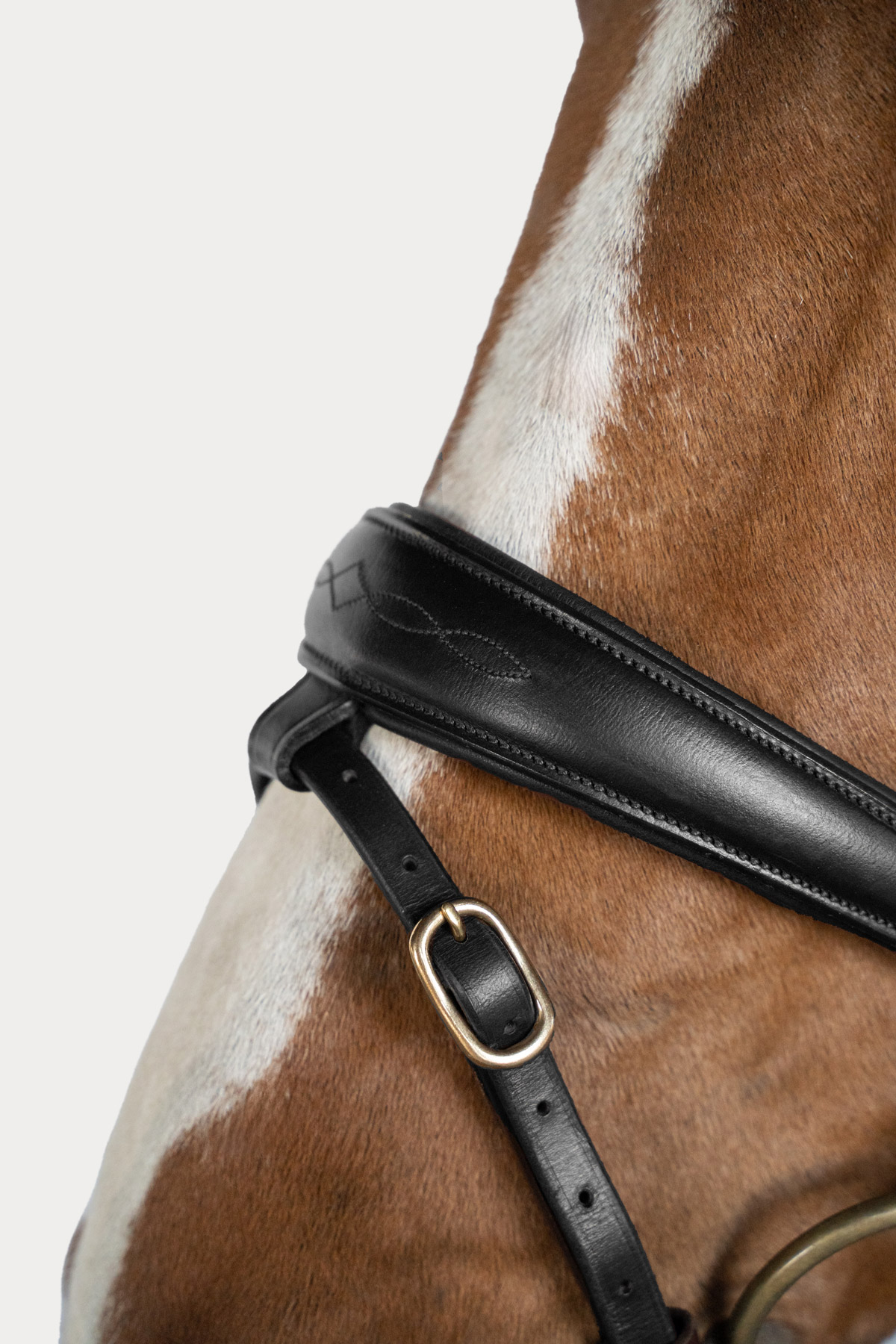 Adding a touch of timeless elegance, the bridle features brass buckles that elevate its design. Crafted entirely from 100% quality leather, it ensures both quality and durability, promising a lasting connection with your horse. The set includes woven reins.