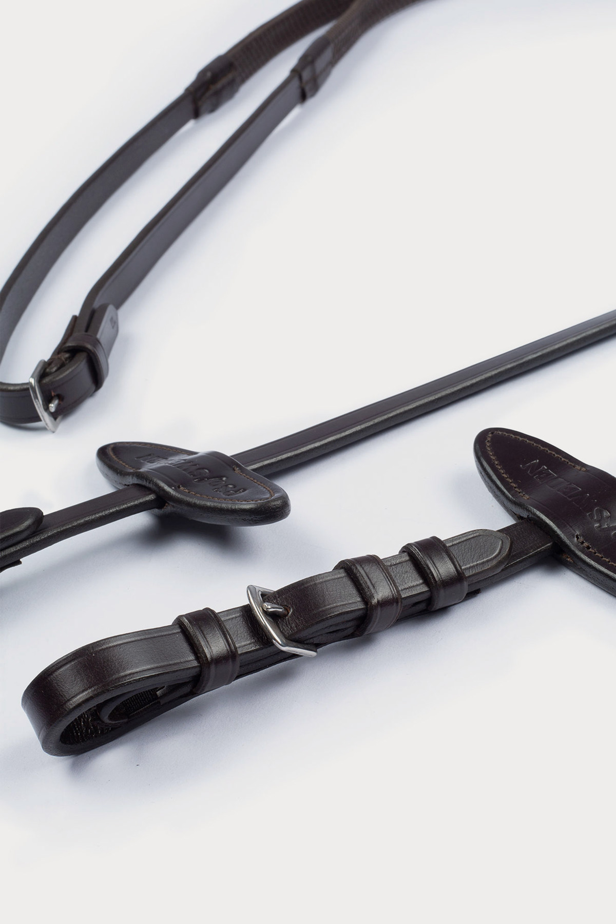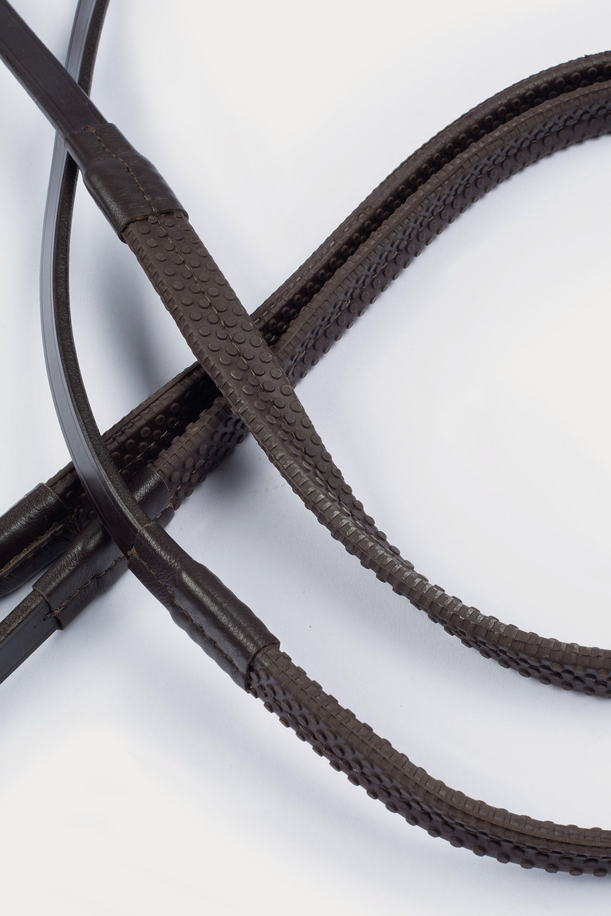 The PS of Sweden Rubber Reins in Brown Leather combine durable, top-quality English leather with a secure rubber grip, providing comfort and control for the rider. Designed with PS of Sweden’s innovative elastic Cradles™, these reins offer softer contact between the horse’s mouth and the rider’s hand, enhancing communication and reducing pressure. If preferred, the Cradles™ can be easily removed by detaching them, offering flexibility based on your horse’s needs. These reins deliver both function and comfort, making them an excellent choice for everyday use.