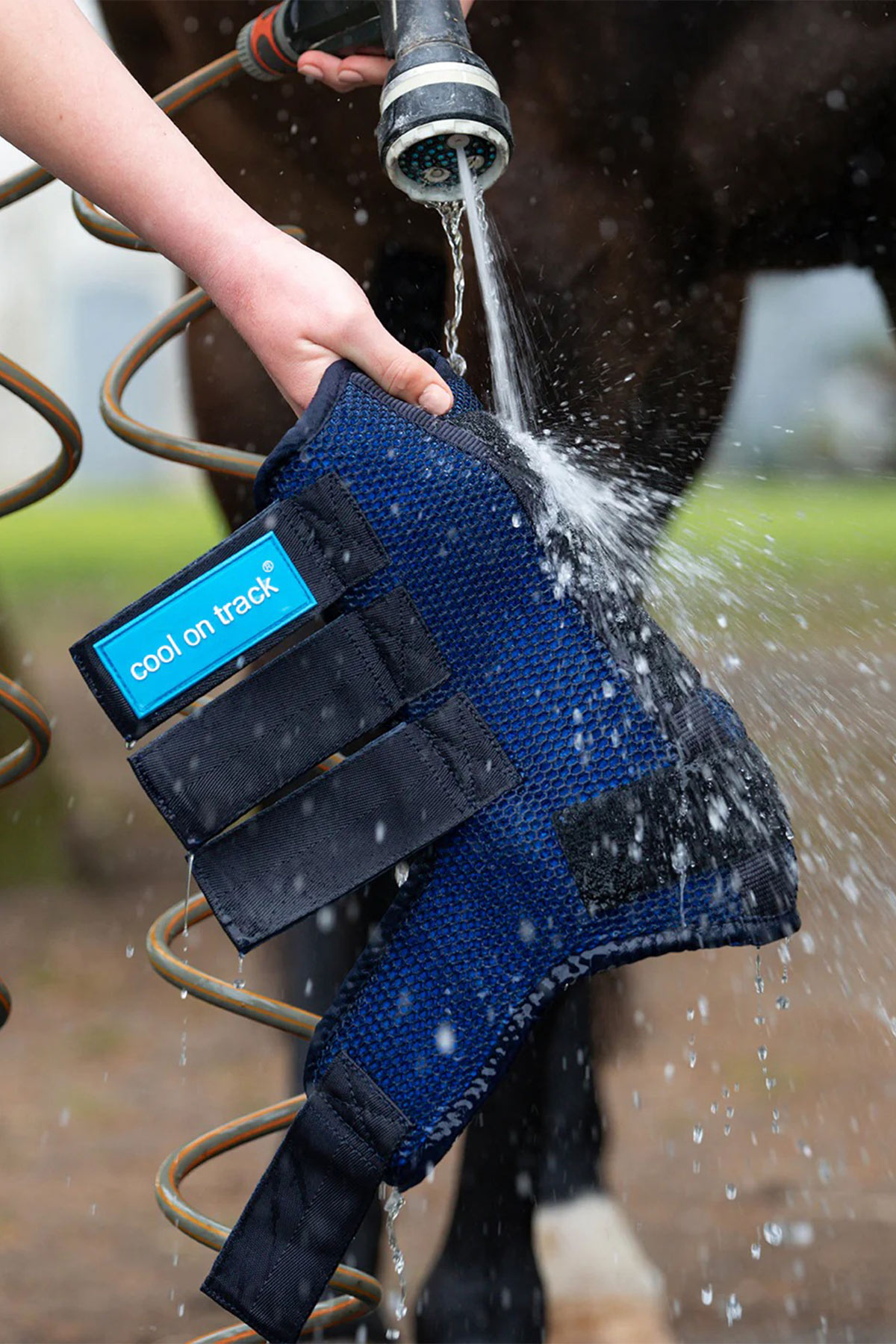 The outer shell features a robust mesh material that allows efficient airflow and promotes the evaporative cooling process. Inside, the technical Cool On Track™ material—made from PVA and cotton—retains moisture just long enough to deliver an effective cooling cycle without the need for a freezer. Wide Velcro straps provide a secure, adjustable fit, while the quick-wrap design ensures ease of application whether you’re at the stable or at a show.