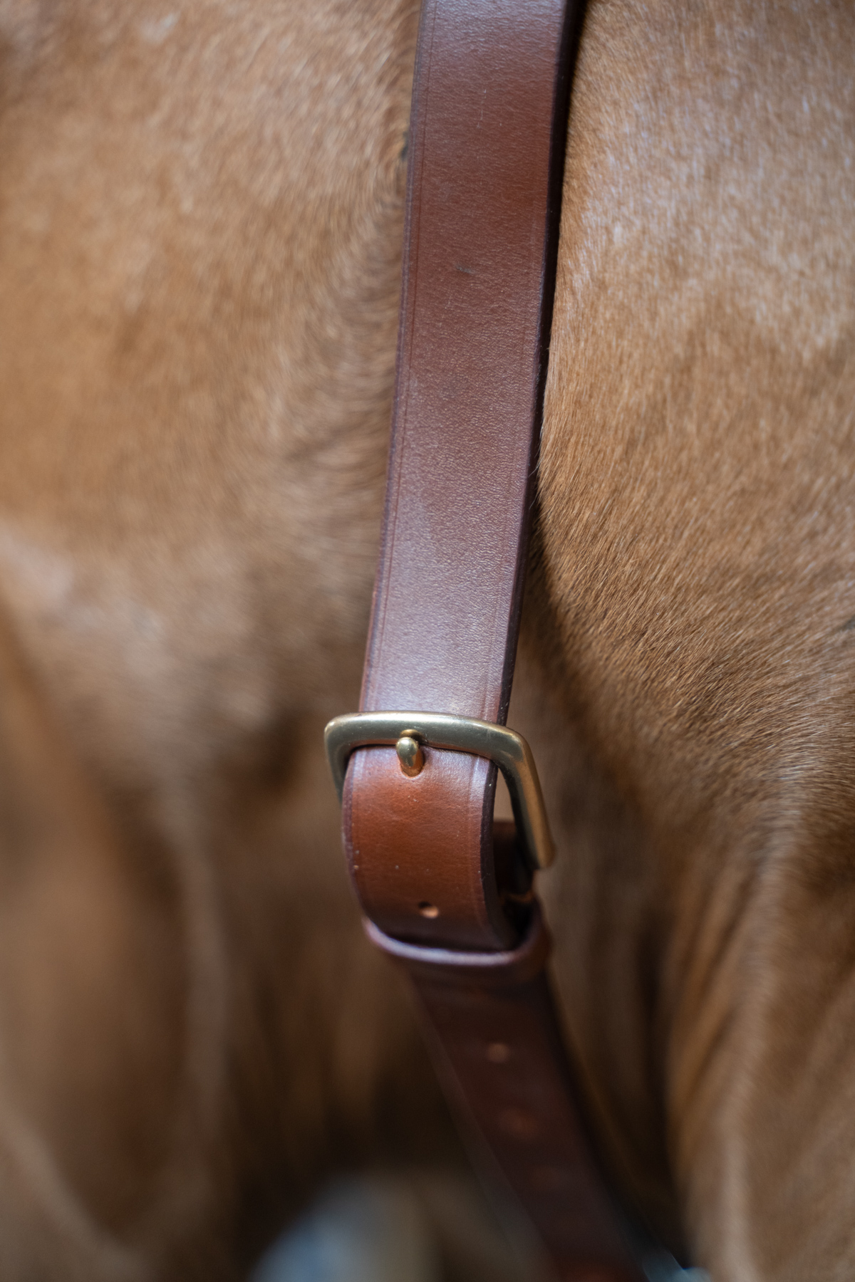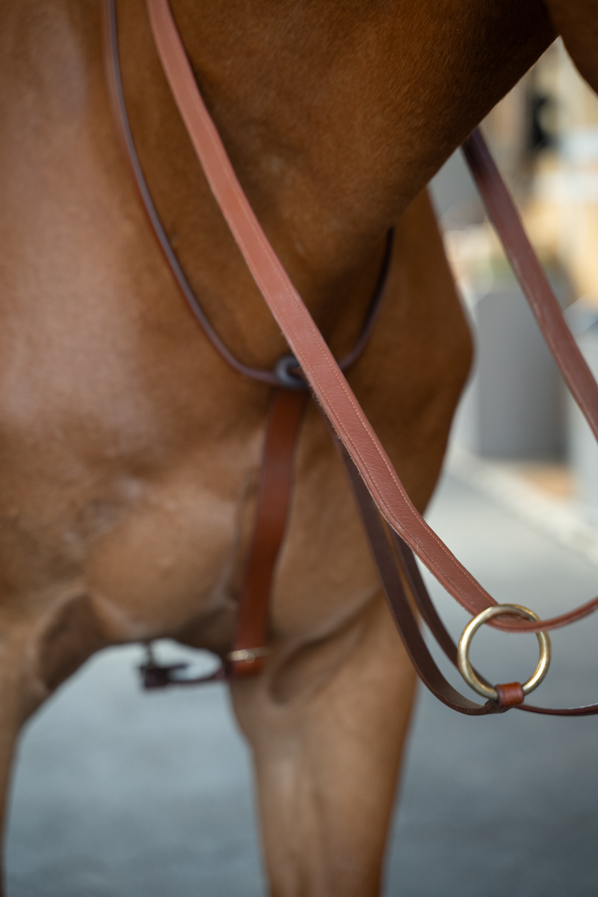 With durable brass buckles and a sleek leather design, this martingale combines strength with elegance, making it a reliable and stylish choice for professional riders. The leather construction not only offers long-lasting durability but also enhances comfort, allowing your horse to move freely while maintaining consistent control.
