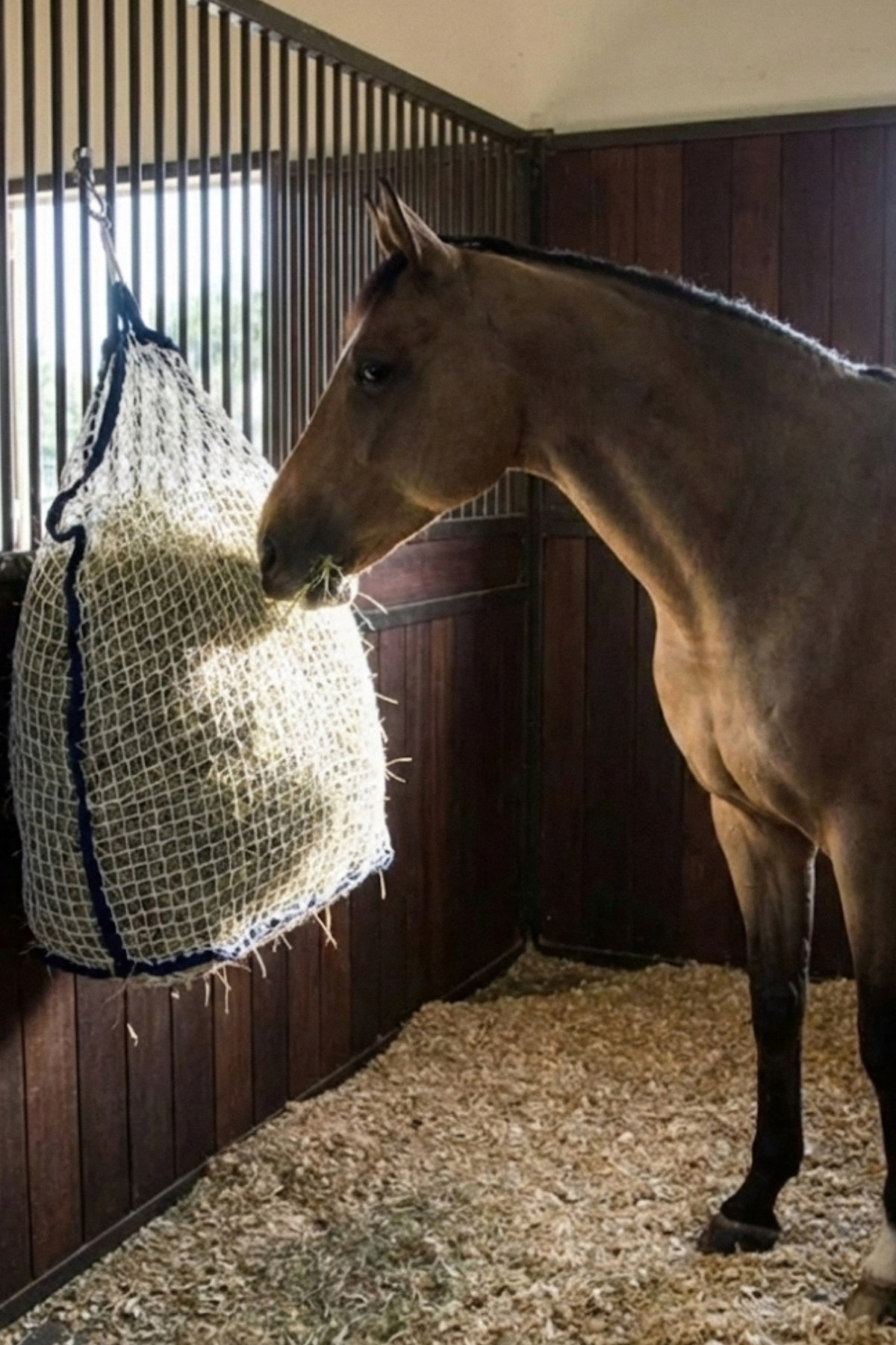 The front mesh features wide fabric strips with a 6 cm mesh size, helping to slow your horse’s hay intake while reducing boredom and supporting healthy digestion. Four top rings combined with two adjustable loops and clips allow for secure and flexible hanging. The loops can also be threaded through the rings to close the net, keeping hay safely contained.