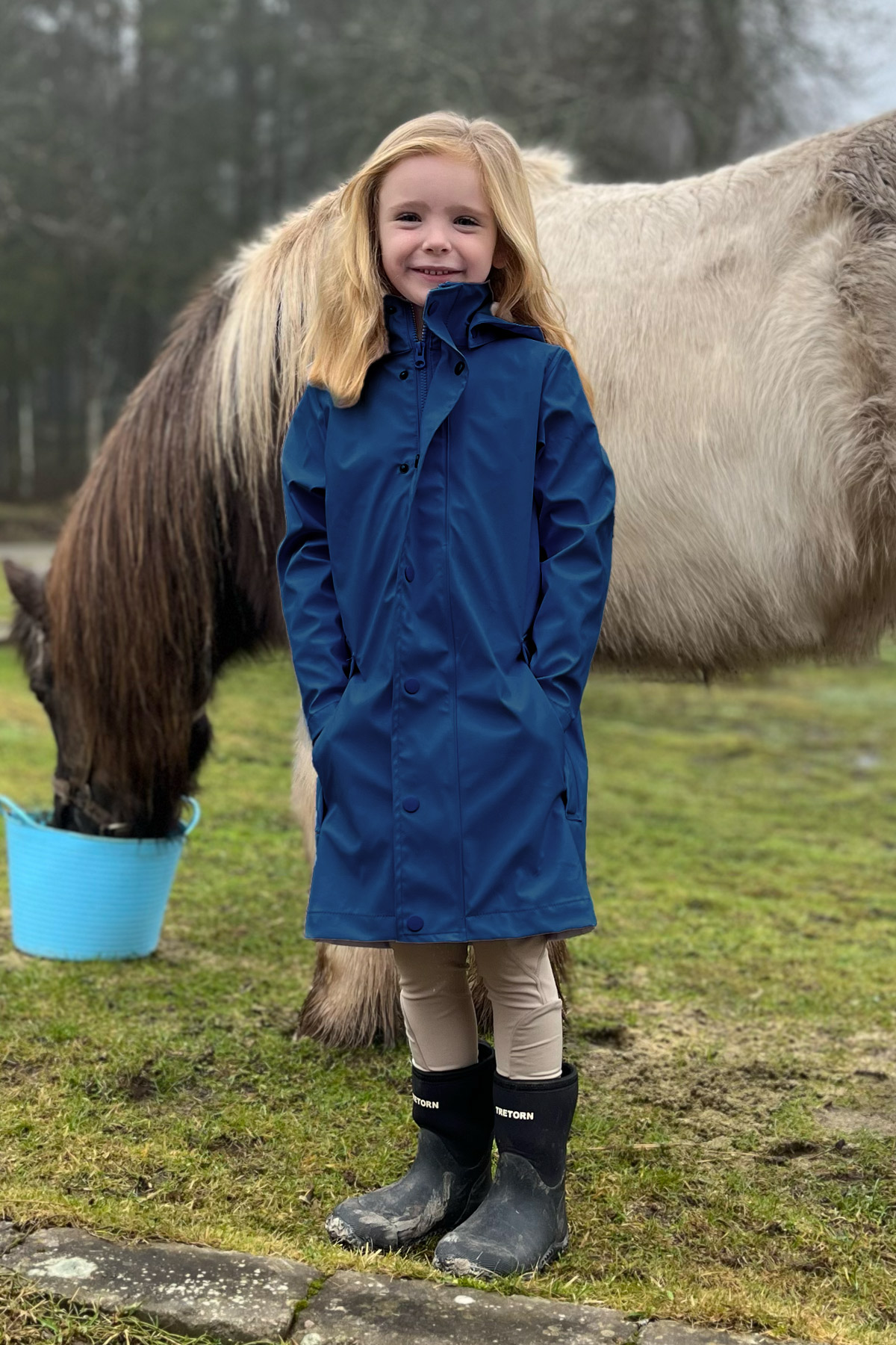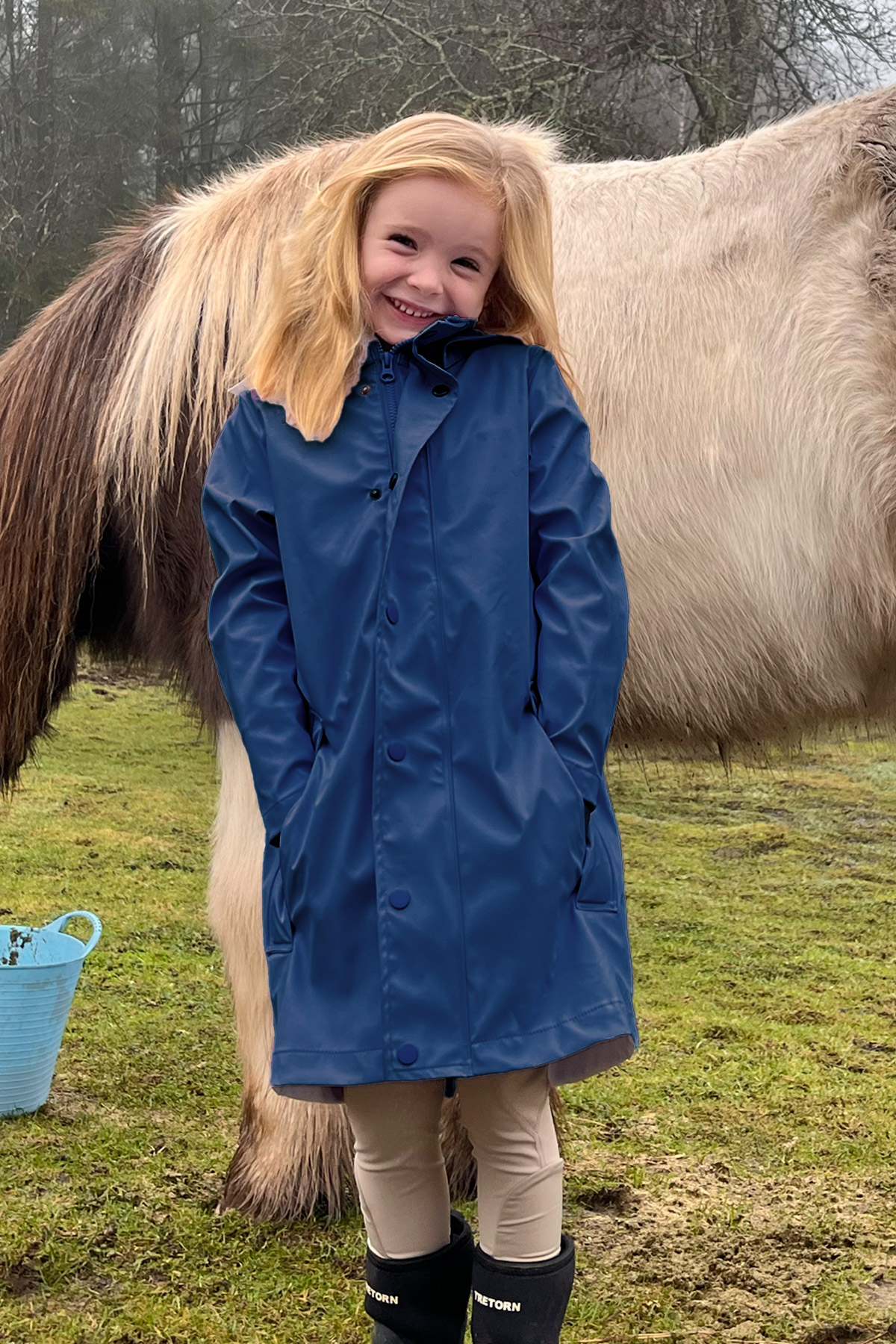 Perfect for unpredictable riding weather, this jacket features a full front zip with snap-button closures, a generous hood for extra protection, and spacious front pockets to keep little essentials safe and dry. Its longer silhouette offers added coverage during barn time or outdoor play, while the lightweight, water-resistant fabric ensures freedom of movement and lasting comfort throughout the day.