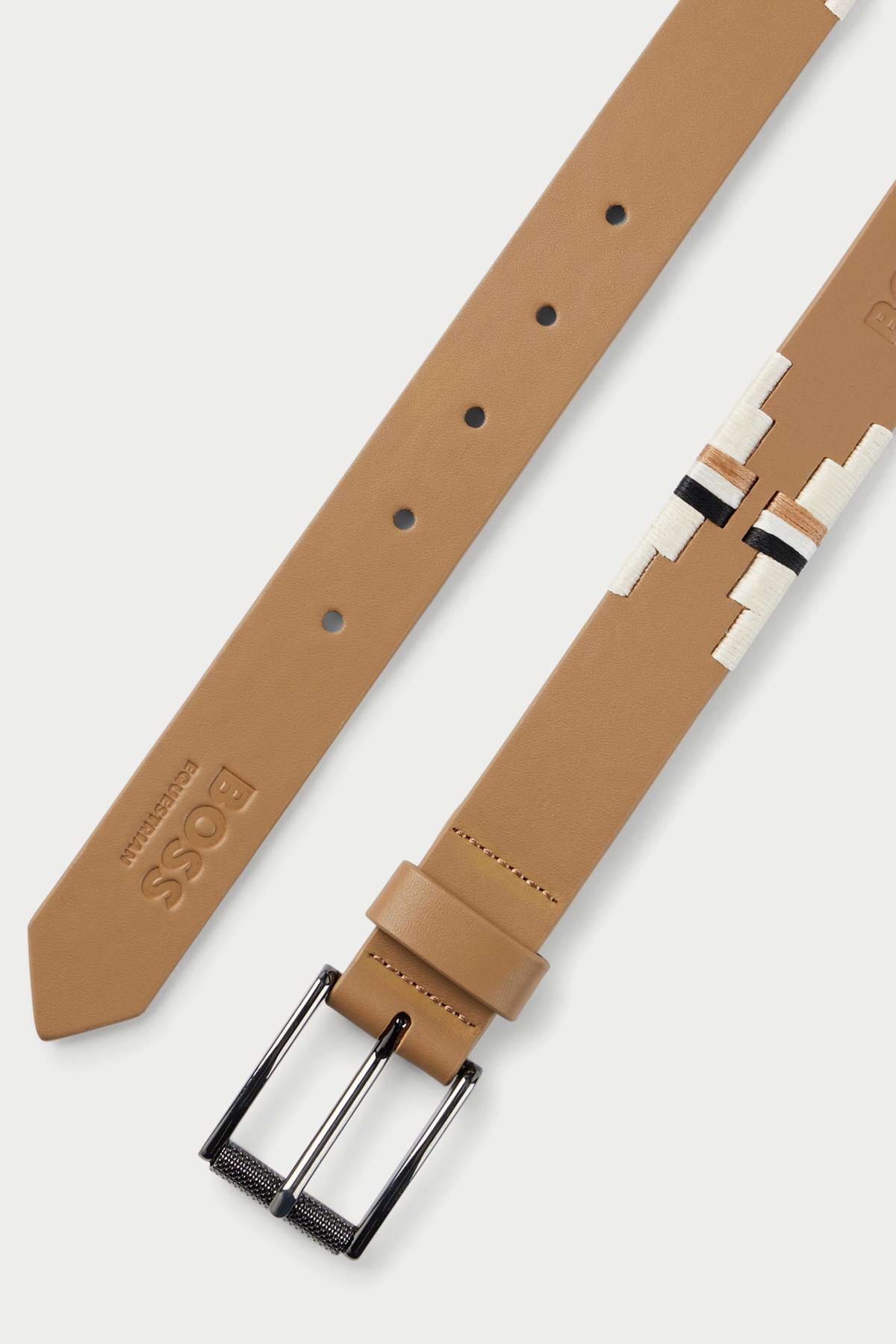 Add a touch of refined elegance to your equestrian wardrobe with the Boss Polo Belt Signature. This distinctive belt combines timeless style with exceptional craftsmanship, featuring a 3.5 cm width that fits neatly through any loop, making it as functional as it is stylish. Hand embroidered with traditional patterns in the signature BOSS stripe, it stands out with its elegant design and attention to detail. The embossed BOSS logos along the strap add a subtle yet sophisticated branding element, elevating its overall appeal.