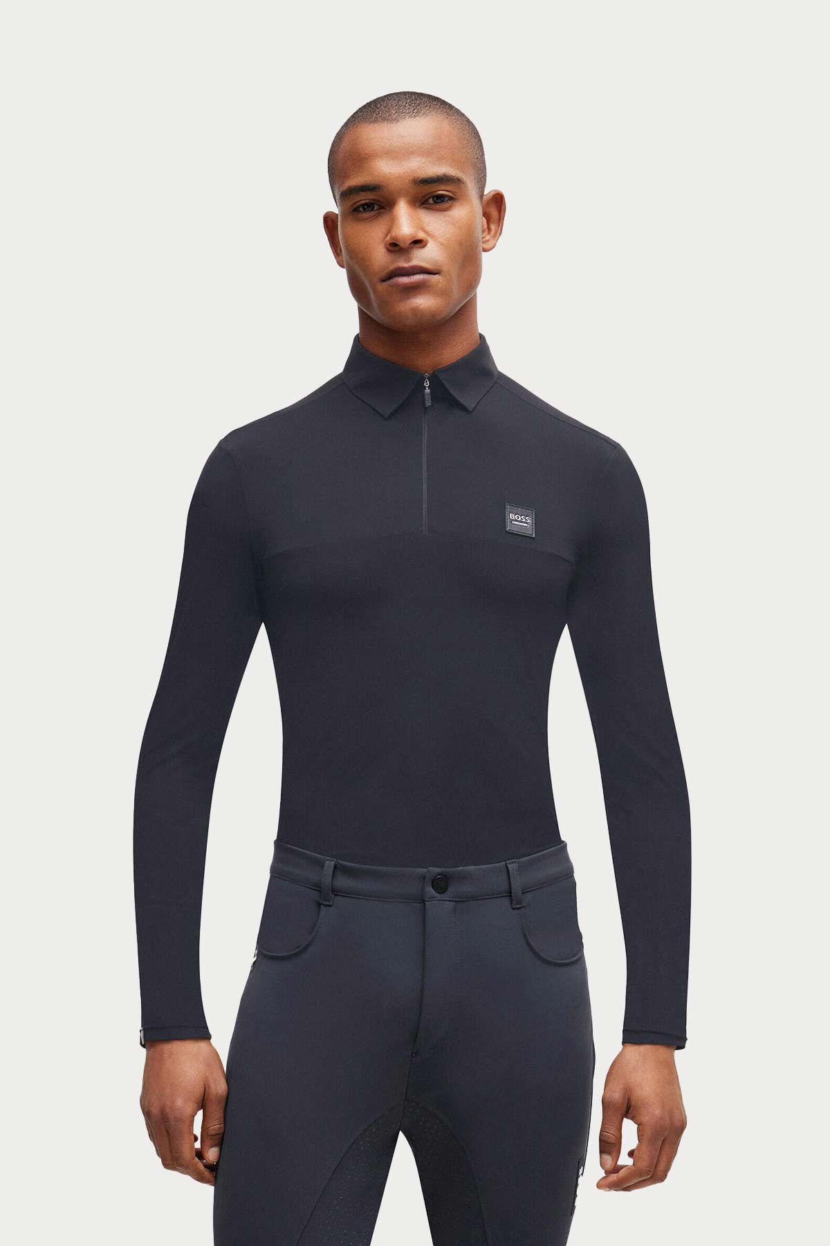 The shirt features a narrow zipped placket with a signature stripe, adding a stylish, athletic touch. The BOSS logo patch in synthetic-coated fabric, resembling faux leather, brings a contemporary edge to this high-performance piece. Designed to offer maximum flexibility, the Elton Training Shirt moves with you, allowing for a full range of motion as you focus on your ride.