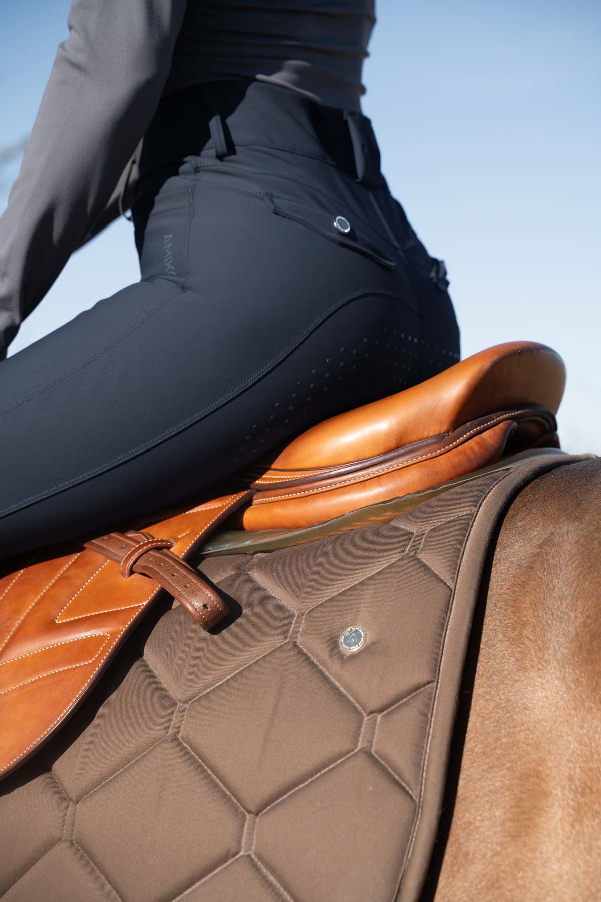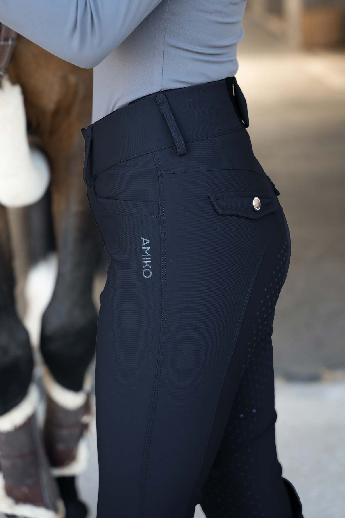 Crafted with a tailored fit and thoughtfully placed back pockets, they deliver a clean, elevated silhouette that transitions effortlessly from training sessions to showgrounds. A subtle, refined Amiko logo on the left hip adds a signature touch without overpowering the look.