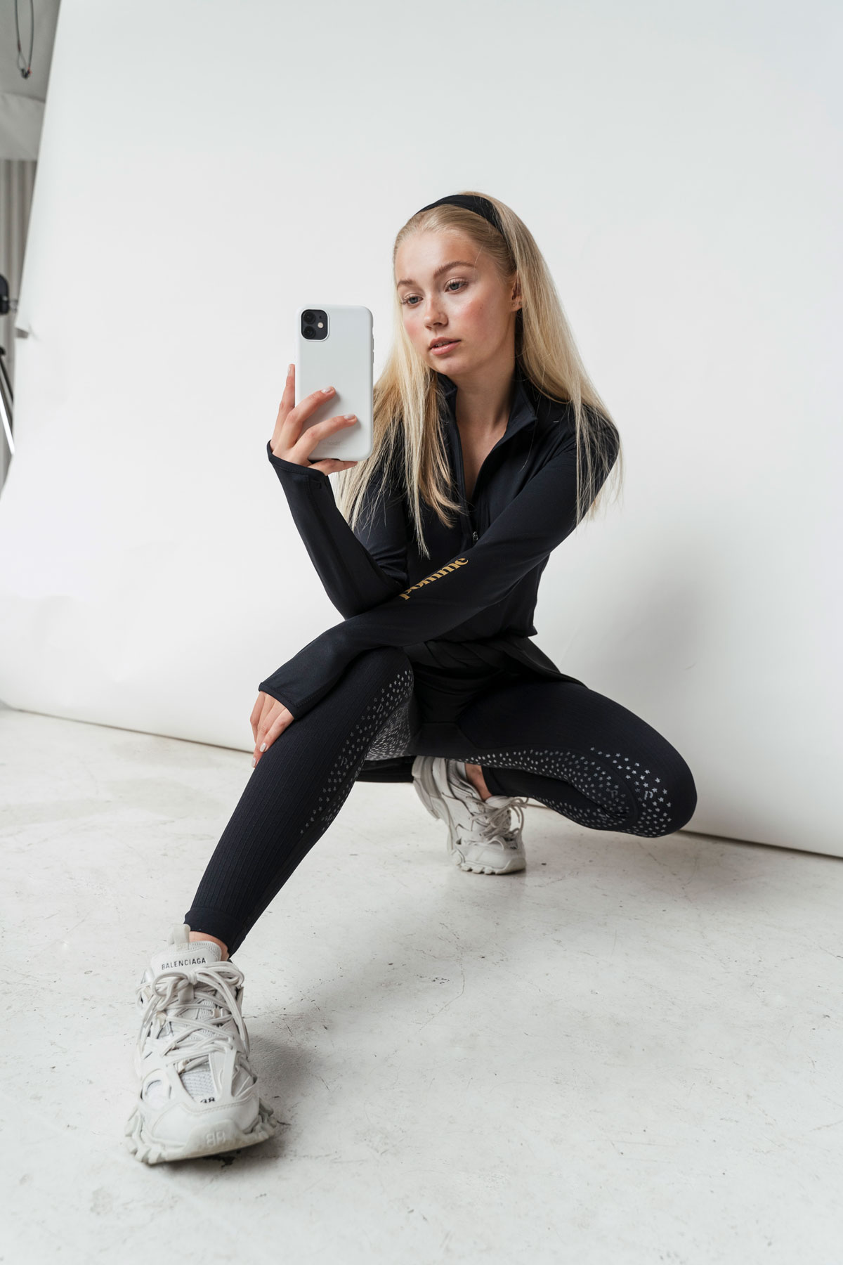 The model wears size x-small. The leggings are normal in size and we recommend you to choose the size you would normally wear. For further information about the sizes, please see the size guide higher up the page.