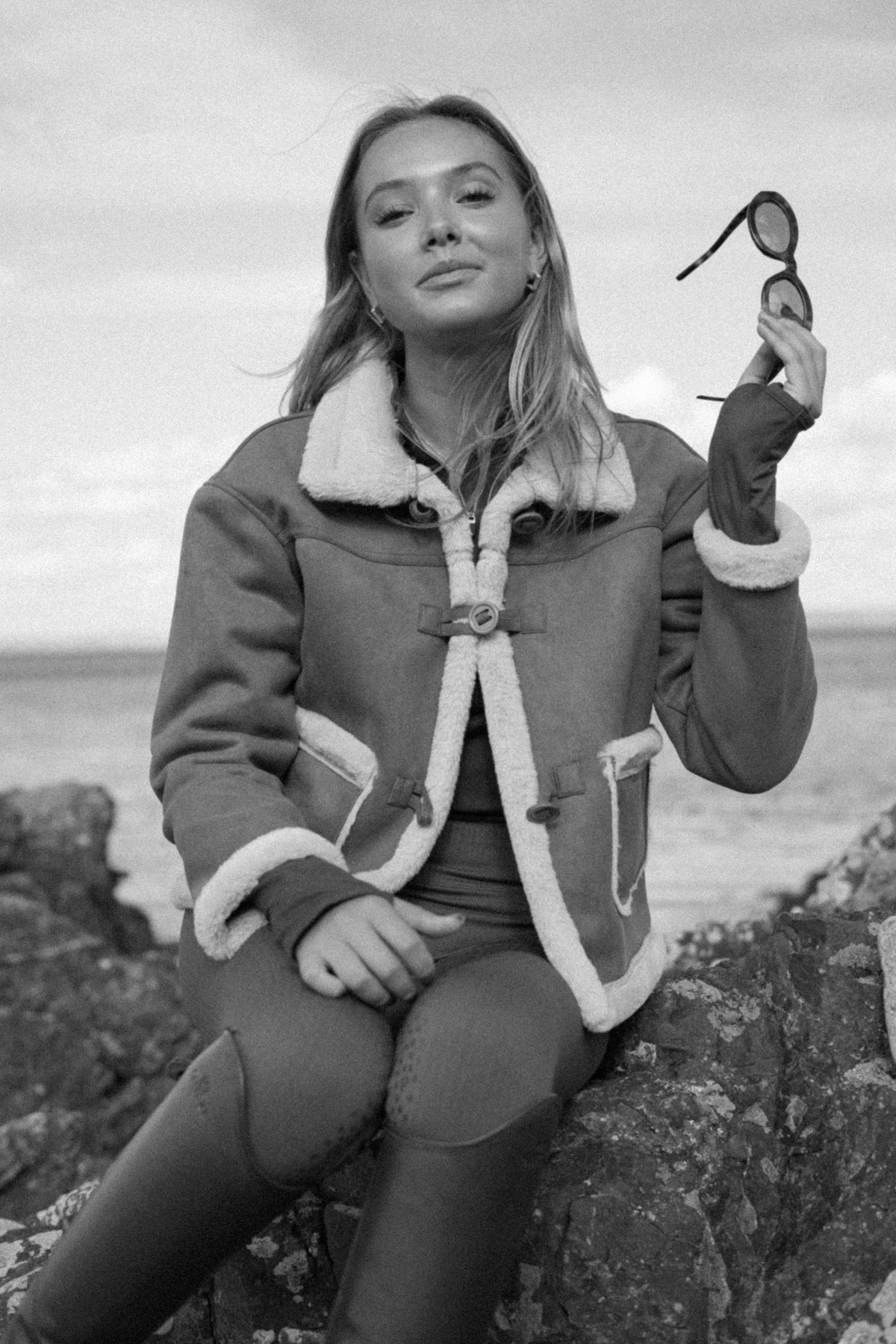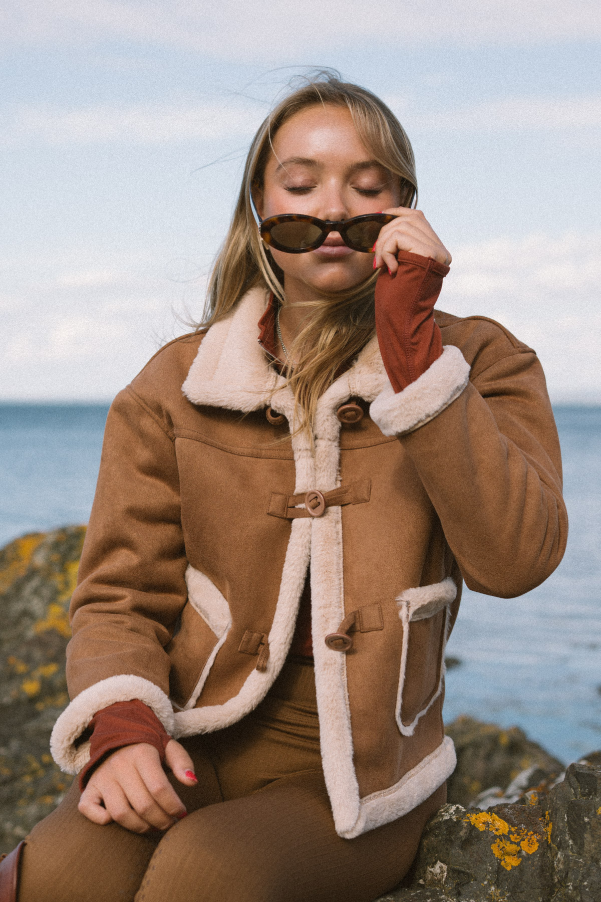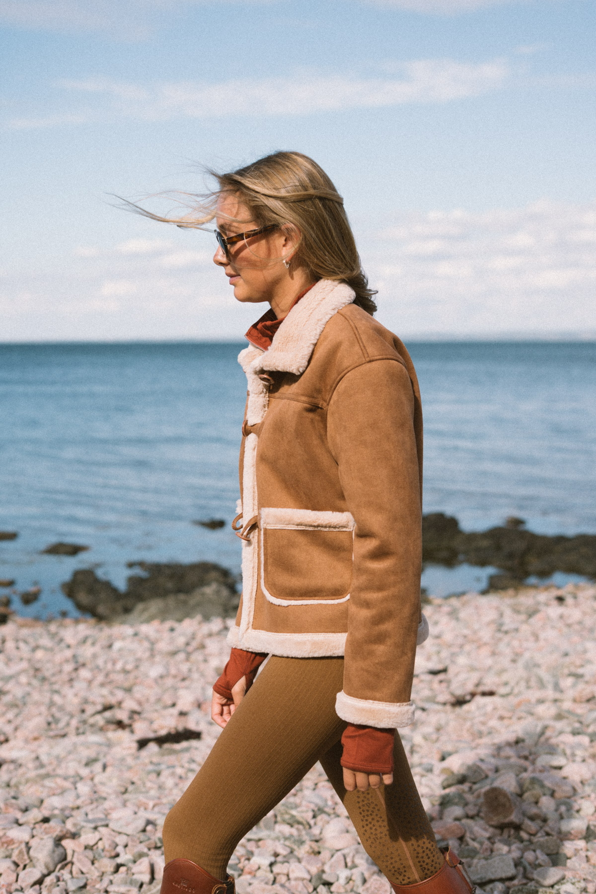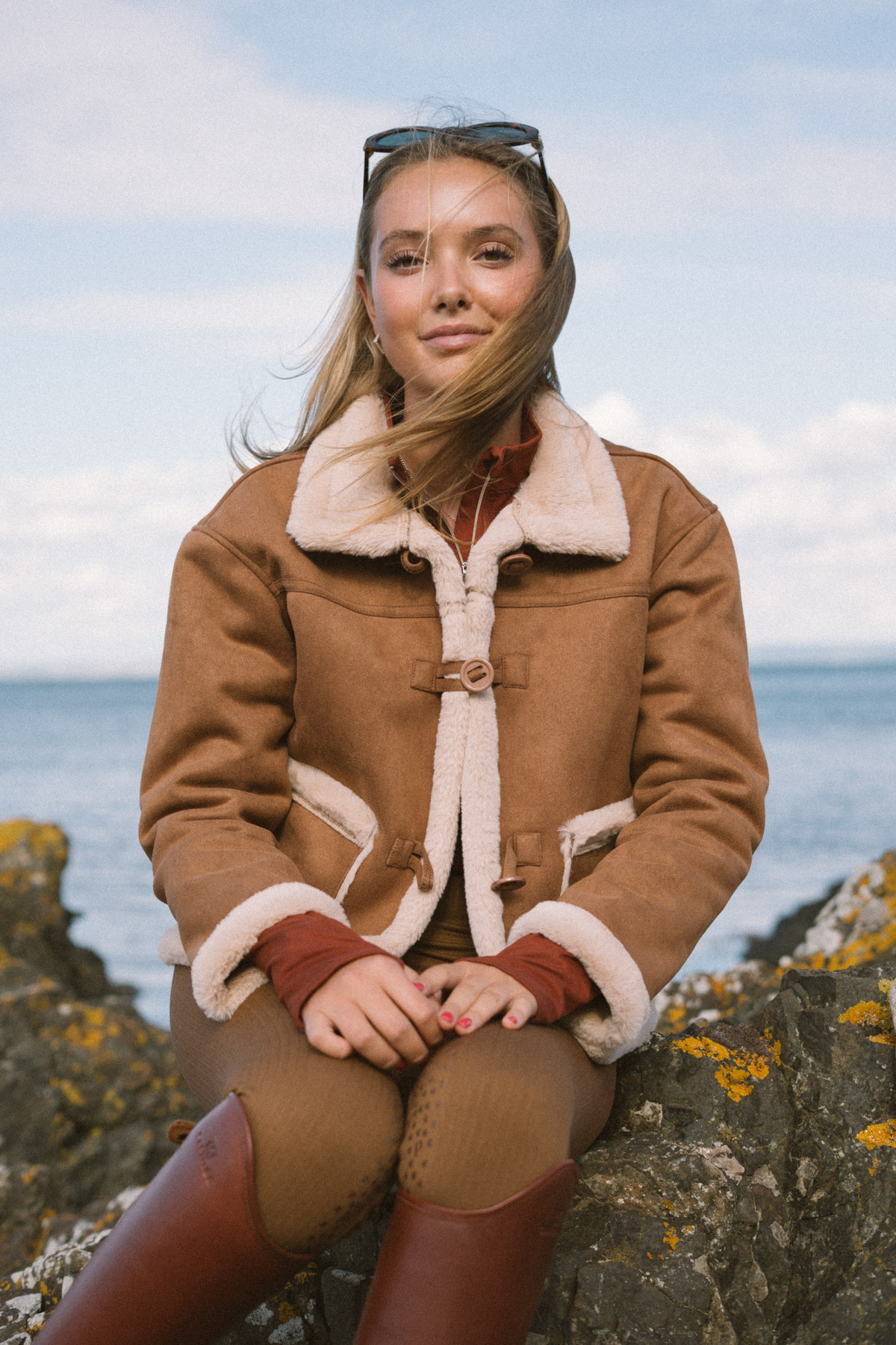 Crafted from supple mocha suede, the jacket is fully lined with plush shearling, providing exceptional insulation on crisp mornings and long winter rides. Thoughtfully finished with shearling along the collar, cuffs, and hem, it balances practicality with understated luxury. The traditional rope-and-knot closure adds a touch of equestrian heritage, while two front pockets keep your essentials close at hand. Mid-length in cut, it offers flattering proportions and easy layering over your riding or everyday outfits.