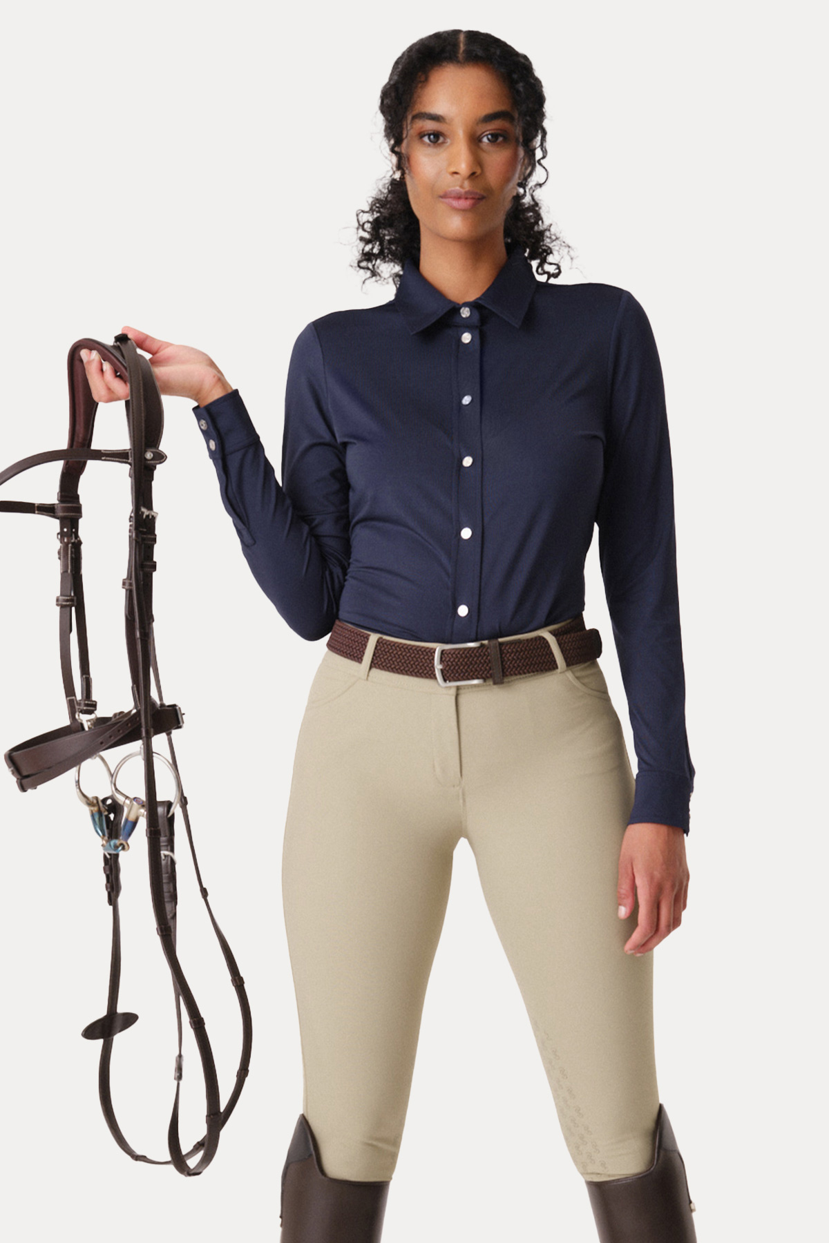 Made from soft and stretchy jersey fabric, this shirt is tailored for riders, ensuring complete comfort and flexibility in the saddle. Its moisture-wicking and four-way-stretch material enhances performance during rides. Whether in the saddle or out of the stable, its slim fit, collar and buttons at the cuffs exude style. Finished with PS monogram buttons in the front, this shirt seamlessly blends functionality with equestrian flair.
